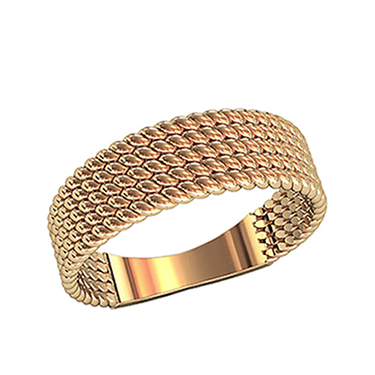 Прекрасный вариант повседневного кольца с интересной фактурой, которая придется по вкусу любителям простых и геометрических форм. Металл изготовления – золото (583 или 750 проба) в красном, белом, лимонном цвете или серебро (925 проба). Принимаем на переработку ваш металл: золото в пробах 500 (турецкое и польское), 750, 583, 885(стоматологическое), 900 (монеты), 999,9 (банковские слитки) и серебро в пробах 875, 900, 916, 925,999,9. Дополнительные услуги: Изменение цвета золота +30% к цене изготовления. Родирование белого золота. Чернение серебра. Цена указана за работу.