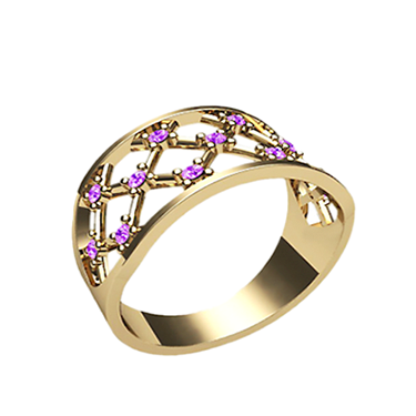 Это кольцо будет прекрасным подарком как для молодой девушки, так и для женщины, которая ценит изысканный стиль. Металл изготовления – золото (583 или 750 проба) в красном, белом, лимонном цвете или серебро (925 проба). Принимаем на переработку ваш металл: золото в пробах 500 (турецкое и польское), 750, 583, 885(стоматологическое), 900 (монеты), 999,9 (банковские слитки) и серебро в пробах 875, 900, 916, 925,999,9. Дополнительные услуги: Изменение цвета золота +30% к цене изготовления. Родирование белого золота. Чернение серебра. Цена указана за работу и не включает стоимость камней (цвет камней –Ваш выбор). Камни мелкие.