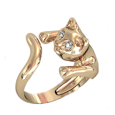 Очаровательное колечко в виде кошки, обнимающей лапками палец владельца. Оно говорит о характере и мироощущении его владелицы, ведь только весьма романтичное создание решится украсить себя подобным образом. Металл изготовления – золото (583 или 750 проба) в красном, белом, лимонном цвете или серебро (925 проба). Принимаем на переработку ваш металл: золото в пробах 500 (турецкое и польское), 750, 583, 885(стоматологическое), 900 (монеты), 999,9 (банковские слитки) и серебро в пробах 875, 900, 916, 925,999,9. Дополнительные услуги: Изменение цвета золота +30% к цене изготовления. Родирование белого золота. Чернение серебра. Цена указана за работу и не включает стоимость камней (цвет камней –Ваш выбор). Камни мелкие.