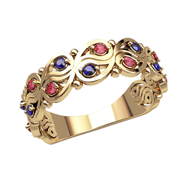 Изысканное ювелирное изделие с миксом камней: капельки красных вставок под рубин и прекрасных фиолетовых – под аметист в золоте. Кольцо хорошо сочетается с серьгами, дополняя комплект к особому случаю и создавая легкий и манящий образ. Металл изготовления – золото (583 или 750 проба) в красном, белом, лимонном цвете или серебро (925 проба). Принимаем на переработку ваш металл: золото в пробах 500 (турецкое и польское), 750, 583, 885(стоматологическое), 900 (монеты), 999,9 (банковские слитки) и серебро в пробах 875, 900, 916, 925,999,9. Дополнительные услуги: Изменение цвета золота +30% к цене изготовления. Родирование белого золота. Чернение серебра. Цена указана за работу и не включает стоимость камней (цвет камней –Ваш выбор). Камни: круглая огранка ø1,5мм*18шт.