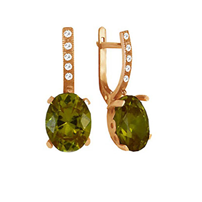 Яркие зеленые камни оттенка хризолит и мерцающие фианиты в золотой фантазии! Эти красивые серьги из золота привлекают внимание, замечательно выглядят и в качестве самостоятельного украшения, и в комплекте с кольцом. Металл изготовления – золото (583 или 750 проба) в красном, белом, лимонном цвете или серебро (925 проба). Принимаем на переработку ваш металл: золото в пробах 500 (турецкое и польское), 750, 583, 885(стоматологическое), 900 (монеты), 999,9 (банковские слитки) и серебро в пробах 875, 900, 916, 925,999,9. Дополнительные услуги: Изменение цвета золота +30% к цене изготовления. Родирование белого золота. Чернение серебра. Цена указана за работу и не включает стоимость камней (цвет камней –Ваш выбор). Камни: огранка овал 10х8 мм по центру.