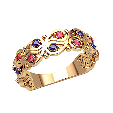 Изысканное ювелирное изделие с миксом камней: капельки красных вставок под рубин и прекрасных фиолетовых – под аметист в золоте. Кольцо хорошо сочетается с серьгами, дополняя комплект к особому случаю и создавая легкий и манящий образ. Металл изготовления – золото (583 или 750 проба) в красном, белом, лимонном цвете или серебро (925 проба). Принимаем на переработку ваш металл: золото в пробах 500 (турецкое и польское), 750, 583, 885(стоматологическое), 900 (монеты), 999,9 (банковские слитки) и серебро в пробах 875, 900, 916, 925,999,9. Дополнительные услуги: Изменение цвета золота +30% к цене изготовления. Родирование белого золота. Чернение серебра. Цена указана за работу и не включает стоимость камней (цвет камней –Ваш выбор). Камни: круглая огранка, мелкие.