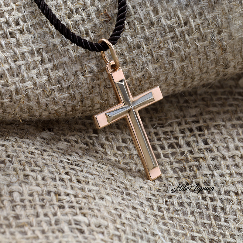 Крест из комбинированного золота (красное, белое). Размер 30х20 мм (без ушка под цепь). Металл изготовления – золото 583 проба.. Принимаем на переработку ваш металл: золото в пробах 500 (турецкое и польское), 750, 583, 885(стоматологическое), 900 (монеты), 999,9 (банковские слитки).