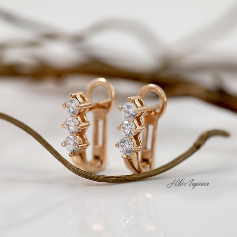 Золотые серьги с тремя камнями и оригинальным замком — это категория украшений, где дизайн не ограничивается формой и блеском вставок, а распространяется и на механизм застёжки, превращая её в часть художественного замысла. Металл изготовления – золото (583 проба) в красном. Принимаем на переработку ваш металл: золото в пробах 500 (турецкое и польское), 750, 583, 885(стоматологическое), 900 (монеты), 999,9 (банковские слитки). Камни: круглая огранка ø3,0мм.