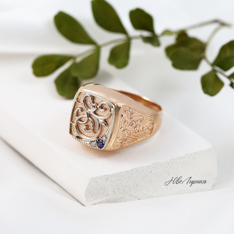 Лаконичная печатка, инкрустирована небольшими камнями и оформлена декором в виде резьбы, станет замечательным акцентом к любому образу. Металл изготовления – золото 583 проба в красном и белом цвете. Принимаем на переработку ваш металл: золото в пробах 500 (турецкое и польское), 750, 583, 885(стоматологическое), 900(монеты), 999,9(банковские слитки). Камни мелкие. Камни Ø 1,5; 2,25 мм. Размер верхней площадки 16х16 мм. Накладка из белого золота.