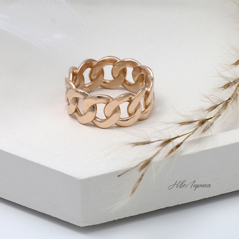 Элементы цепи придают этому кольцу легкость и изящество. Украшение подчеркнет Ваш тонкий вкус и оригинальность при выборе ювелирных изделий. Металл изготовления – золото (583 проба) в красном цвете. Принимаем на переработку ваш металл: золото в пробах 500 (турецкое и польское), 750, 583, 885(стоматологическое), 900 (монеты), 999,9 (банковские слитки).