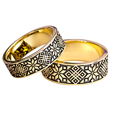 Мы хотели, чтобы наши кольца были не просто красивыми. Мы хотели, чтобы они несли смысл. Чтобы они защищали. Чтобы они связывали нас не только друг с другом, но и с теми, кто был до нас. Символы создавались и совершенствовались столетиями, они вобрали в себя особые сакральные смыслы: семья, род, плодовитость, материнство, огонь, мужское начало. Данная модель обручальных колец изготавливается индивидуально под нужные размеры и параметры. Металл изготовления – золото (583 или 750 проба) в красном, белом, лимонном цвете или серебро (925 проба). Принимаем на переработку ваш металл: золото в пробах 500 (турецкое и польское), 750, 583, 885(стоматологическое), 900 (монеты), 999,9 (банковские слитки) и серебро в пробах 875, 900, 916, 925,999,9. Дополнительные услуги: Изменение цвета золота +30% к цене изготовления. Родирование белого золота. Чернение серебра. Сочетание глянцевой полированной поверхности элементов и покрытие углублений фона чёрным родием. Цена указана за работу (за изготовление одного кольца). Родий оплачивается дополнительно.