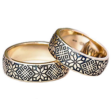 "Сям'я" и "Агонь" - тепло домашнего очага. Наиболее популярна в обручальных кольцах классическая, округлая форма с обережными символами семьи, рода, материнства, огня, мужчины, его начала. Подобный рисунок на свадебных кольцах означает верность до конца дней, почитание и любовь, стремление вместе преодолеть все трудности. Это украшение несет в себе мощный энергетический импульс. Данная модель обручальных колец изготавливается индивидуально под нужные размеры и параметры. Сочетание глянцевой полированной поверхности элементов и покрытие углублений фона родием. Металл изготовления – золото (583 или 750 проба) в красном, белом, лимонном цвете или серебро (925 проба). Принимаем на переработку ваш металл: золото в пробах 500 (турецкое и польское), 750, 583, 885(стоматологическое), 900 (монеты), 999,9 (банковские слитки) и серебро в пробах 875, 900, 916, 925,999,9. Дополнительные услуги: Изменение цвета золота +30% к цене изготовления. Родирование белого золота. Чернение серебра. Цена указана за работу (без покрытия родием).