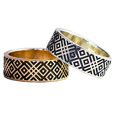 Основным популярным древнеславянским символом на современных обручальных кольцах является символ Семьи. Кольца с замкнутым обережным орнаментом образуют свой собственный мир. Семья живет не сама по себе, а в соответствии с традициями и волею богов, продлевая свой род. Данная модель обручальных колец изготавливается индивидуально под нужные размеры и параметры. Сочетание глянцевой полированной поверхности элементов и покрытие углублений фона чёрным родием. Металл изготовления – золото (583 или 750 проба) в красном, белом, лимонном цвете или серебро (925 проба). Принимаем на переработку ваш металл: золото в пробах 500 (турецкое и польское), 750, 583, 885(стоматологическое), 900 (монеты), 999,9 (банковские слитки) и серебро в пробах 875, 900, 916, 925,999,9. Дополнительные услуги: Изменение цвета золота +30% к цене изготовления. Родирование белого золота. Чернение серебра. Цена указана за работу (без родирования), за изготовление одного кольца. Такие кольца можно изготовить округлой формы.