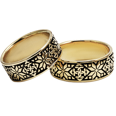 Каждый узор колец несет в себе тот или иной смысл, раскрывает определенную идею. Одни узоры символизируют память о предках, вторые высказывают обращение к богам-покровителям, третьи олицетворяют природные явления, четвертые отображают чувства и надежды человека. Данная модель обручальных колец изготавливается индивидуально под нужные размеры и параметры. Металл изготовления – золото (583 или 750 проба) в красном, белом, лимонном цвете или серебро (925 проба). Принимаем на переработку ваш металл: золото в пробах 500 (турецкое и польское), 750, 583, 885(стоматологическое), 900 (монеты), 999,9 (банковские слитки) и серебро в пробах 875, 900, 916, 925,999,9. Дополнительные услуги: Изменение цвета золота +30% к цене изготовления. Родирование. Чернение серебра. Цена указана за работу (за изготовление одного кольца). Родий оплачивается дополнительно.