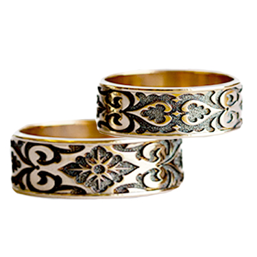Каждый узор колец несет в себе тот или иной смысл, раскрывает определенную идею. Одни узоры символизируют память о предках, вторые высказывают обращение к богам-покровителям, третьи олицетворяют природные явления, четвертые отображают чувства и надежды человека. Данная модель обручальных колец изготавливается индивидуально под нужные размеры и параметры. Металл изготовления – золото (583 или 750 проба) в красном, белом, лимонном цвете или серебро (925 проба). Принимаем на переработку ваш металл: золото в пробах 500 (турецкое и польское), 750, 583, 885(стоматологическое), 900 (монеты), 999,9 (банковские слитки) и серебро в пробах 875, 900, 916, 925,999,9. Дополнительные услуги: Изменение цвета золота +30% к цене изготовления. Родирование. Чернение серебра. Цена указана за работу (без родирования), за изготовление одного кольца.