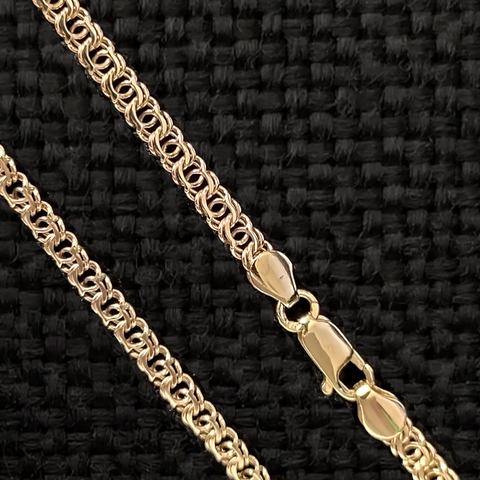 Плетение "Арабский Бисмарк" - узор похож на арабскую вязь, а в его гранях красиво отражается солнце. Цепочки в этой технике плетения полностью оправдывают надежды — они прочные, эффектные, служат долго и на совесть. Соединения между звеньями настолько крепкие, что если и происходит поломка цепочки, то обычно ломается застежка. Загляните в раздел НАШИ РАБОТЫ и оцените наше мастерство. Выберите то, что принесёт Вам удовольствие! Металл изготовления – золото (583 или 750 проба) в красном, белом, лимонном цвете или серебро (925 проба). Принимаем на переработку ваш металл: золото в пробах 500 (турецкое и польское), 750, 583, 885(стоматологическое), 900(монеты), 999,9(банковские слитки) и серебро в пробах 875, 900, 916, 925,999,9. Дополнительные услуги: Изменение цвета золота +30% к цене изготовления. Чернение серебра. Расчет цены и веса - индивидуально.